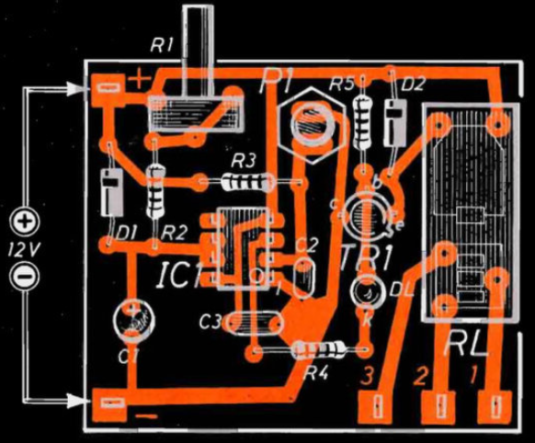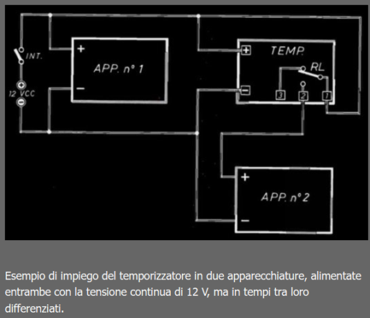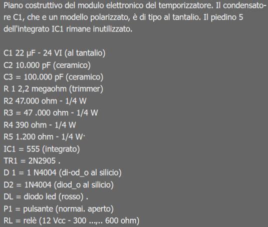 Circuito teorico del temporizzatore nel quale i tempi di esercizio, compresi fra 1" e 30", vengono fissati tramite R1. Il pulsante P1 comanda il reset, mentre il diodo led DL segnala la sensibilizzazione del relè RL.